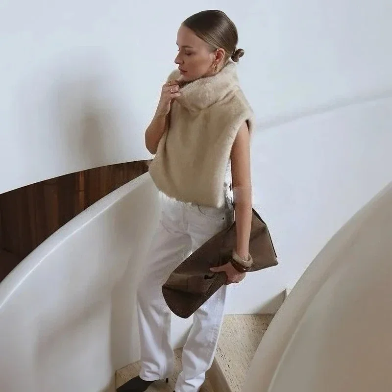 2025 Brand Fashion Faux Fur Sable Vest Crop Top Autumn Winter Turtleneck Eco Mink Fur Tank Tops Sleeveless Jacket Coat