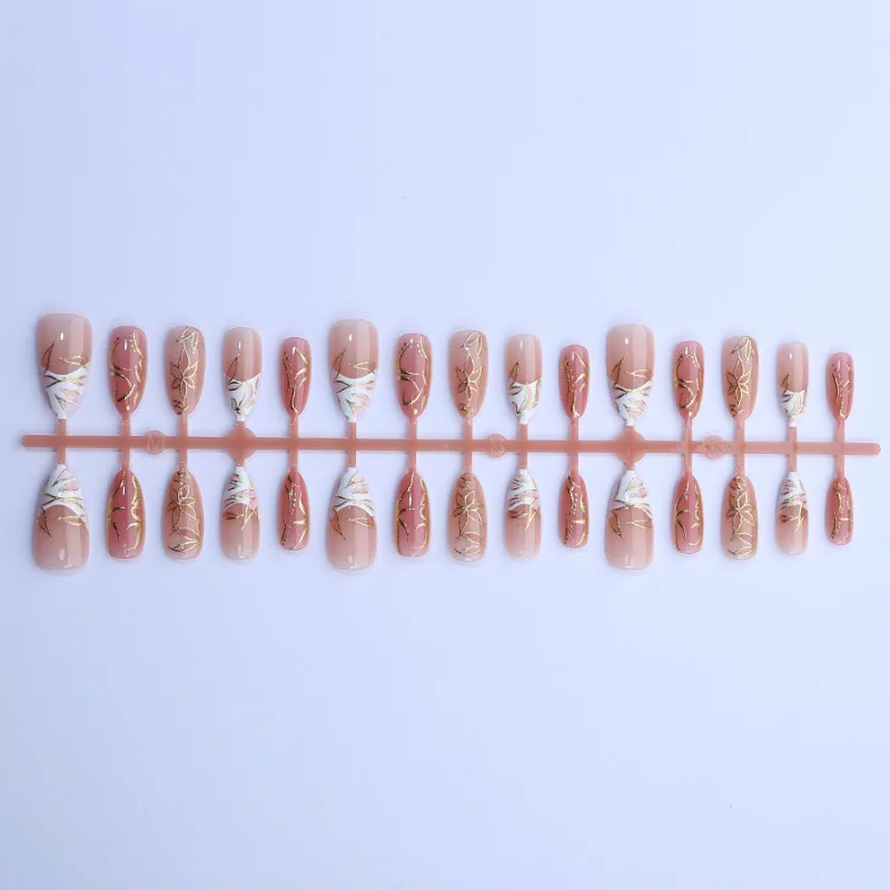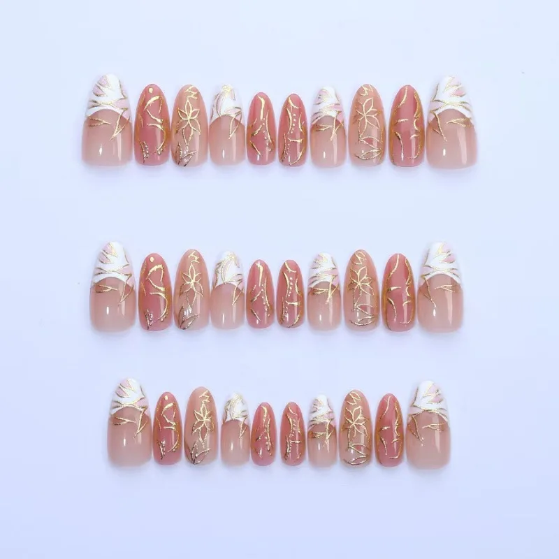 24PCS Luxury Golden Flower Irregular Lines Almond False Nails