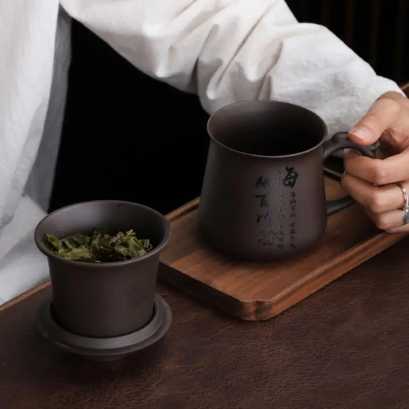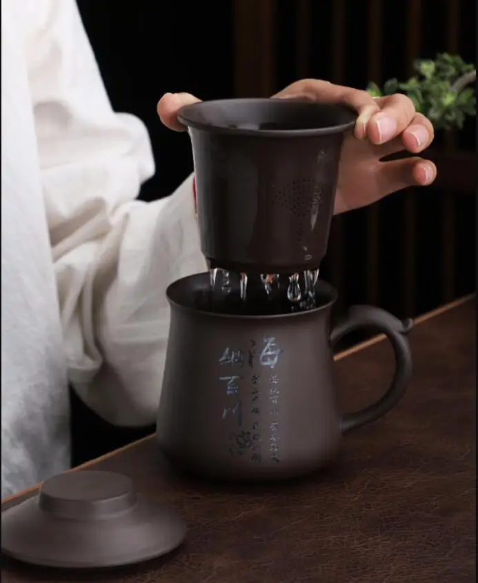 THE SIMPLEST USAGE. Fill the tea leaves into a mesh of our tea mug with infuser, put the mesh into a cup and pour the water of the necessary temperature (depending on the sort of tea), close the big tea cup with a lid and let the tea brew. Then open the lid and pull out the infuser with the leaves. Exquisite.Natural clay works, the surface retained the texture of clay, very retro.
