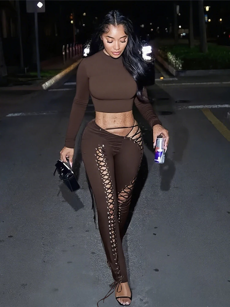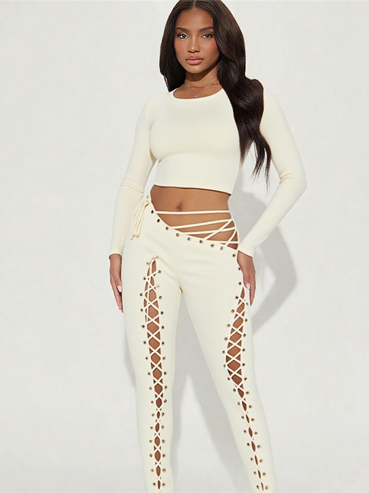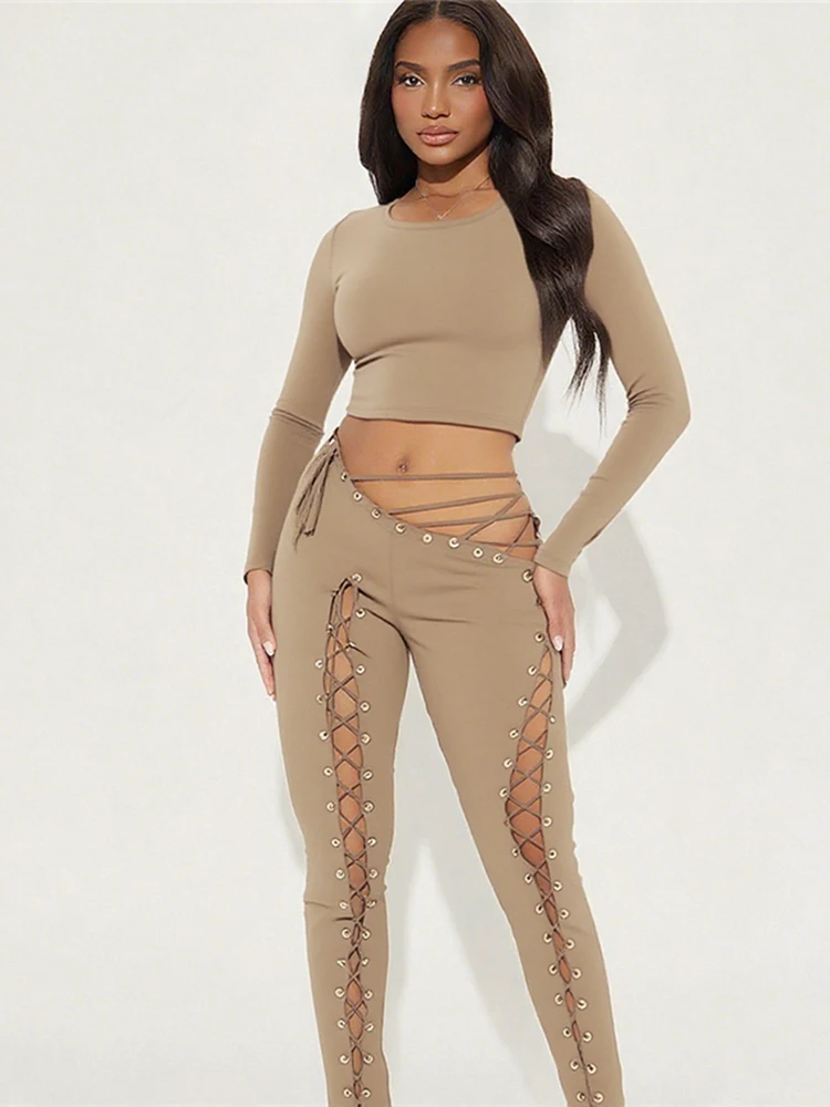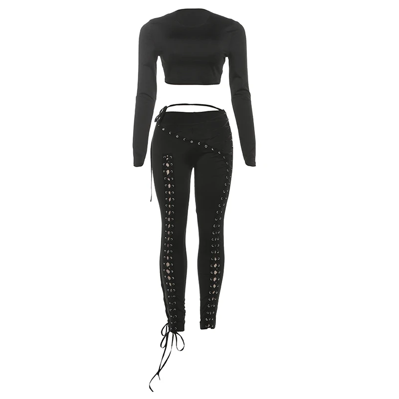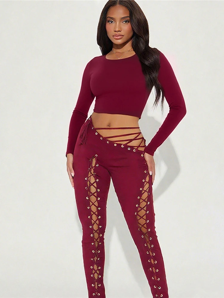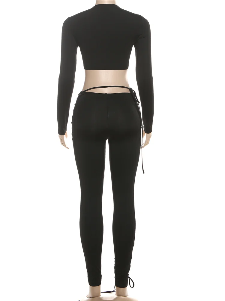 Solid Full Sleeve Crop Tops+Drawstring Slash Waist Pants Set