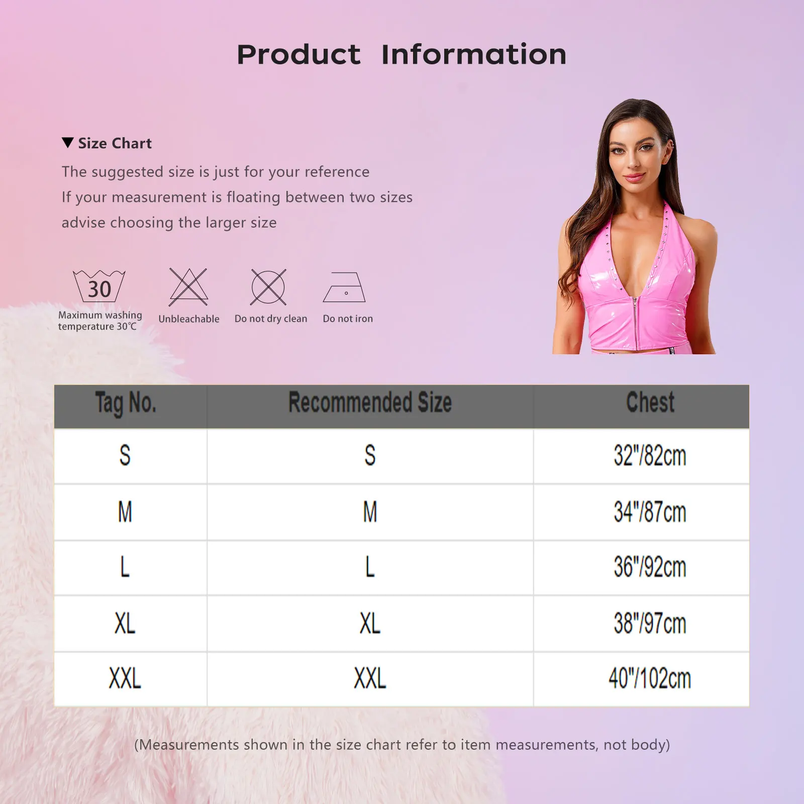 Size Chart: The suggested size is just for your reference. If your measurement is floating between two sizes, advise choosing the larger size. (Measurements shown in the size chart refer to item measurements, not body)